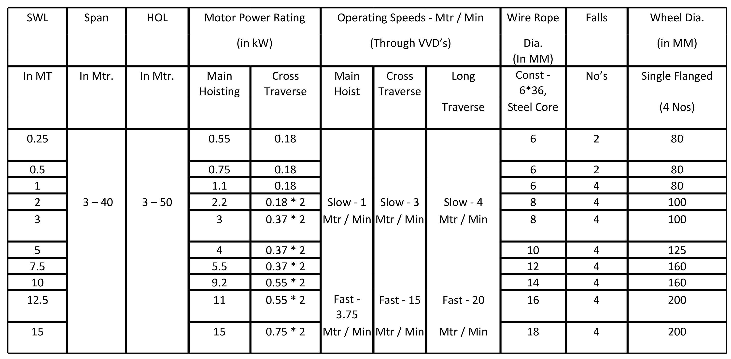 Single girder crane consist of single bridge girder supported on two end trucks. It has a trolley hoist mechanism that runs on the bottom flange of the bridge girder. Single girder bridge cranes generally have a maximum span between 6 to15 meters with a maximum lift of 5-15 meters. They are used for light to moderate service and are cost effective to use as a standby crane (Not frequently used). Total cost of single girder cranes on crane components, runway structure and building is low.
